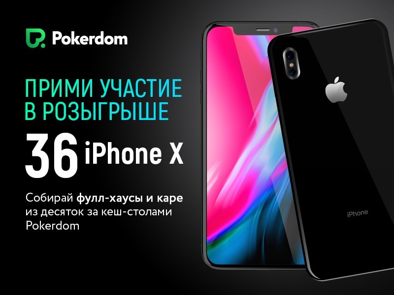 - «36 iPhone X для всех игроков Pokerdom» — промо-акция, в рамках которой клиенты рума могут стать обладателем новенького «яблочного» девайса. Для этого нужно собирать бонусные баллы и оказаться среди призеров таблицы лидеров.